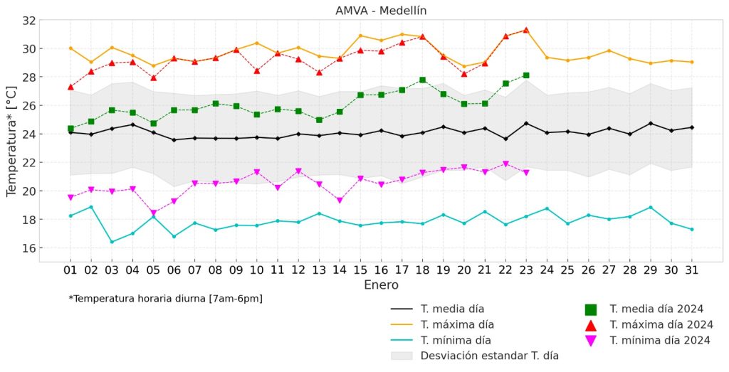Los últimos días de enero han sido los más calurosos en Medellín y el Valle de Aburrá, alcanzando niveles de temperatura muy altos históricamente. Incluso la temperatura media del día ha estado por encima de su promedio, por encima de un grado, desde el 15 de enero hasta la fecha.