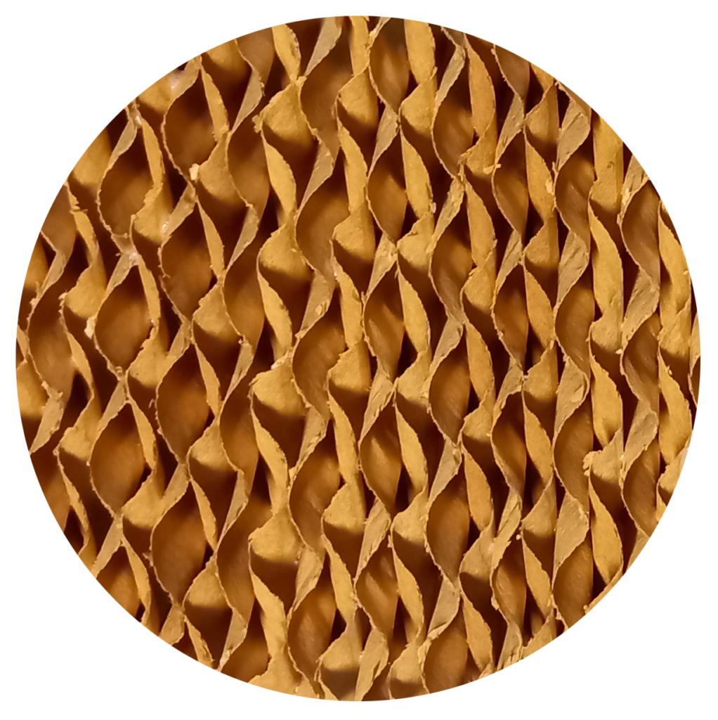La estructura de ángulos del panel permite manejar altas velocidades de aire sin arrastre de gotas. El Panel de Enfriamiento Evaporativo está hecho de Celulosa.